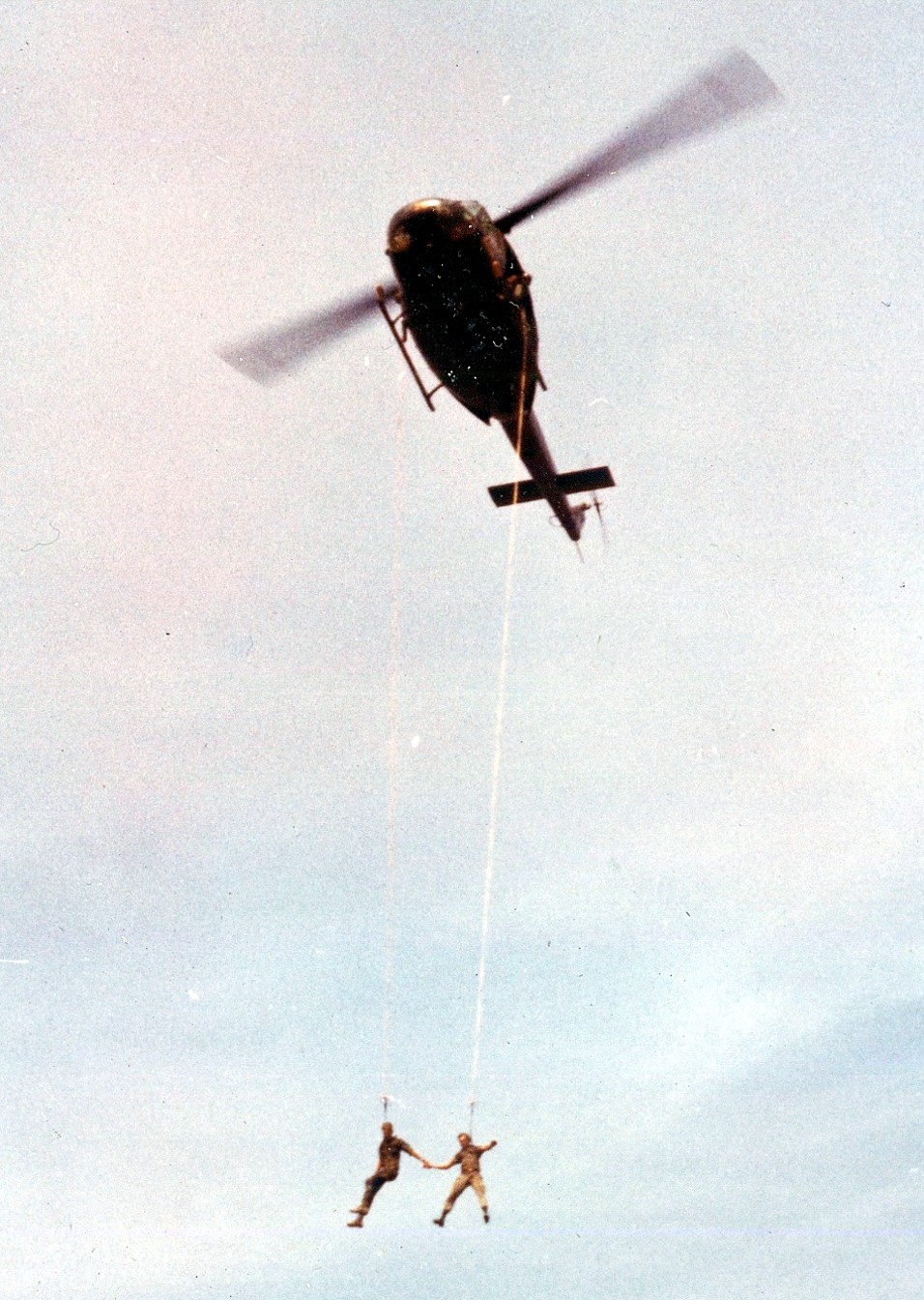 October 7th-10th of this year I met Bob Fellin for the first time in 42 years. He brought a photo book with him. I talked to him about that day. I told him how thankful I was the he allowed me to go up first. He looked at me and said that never happened. He said the enemy was starting to move in so they dropped down ropes and harnesses and we were slung out of there under the chopper. I thought man this guy doesn’t know what he is talking about. Then he showed me the picture that someone took of him and I attached by rope to the bottom of the chopper flying through the air.