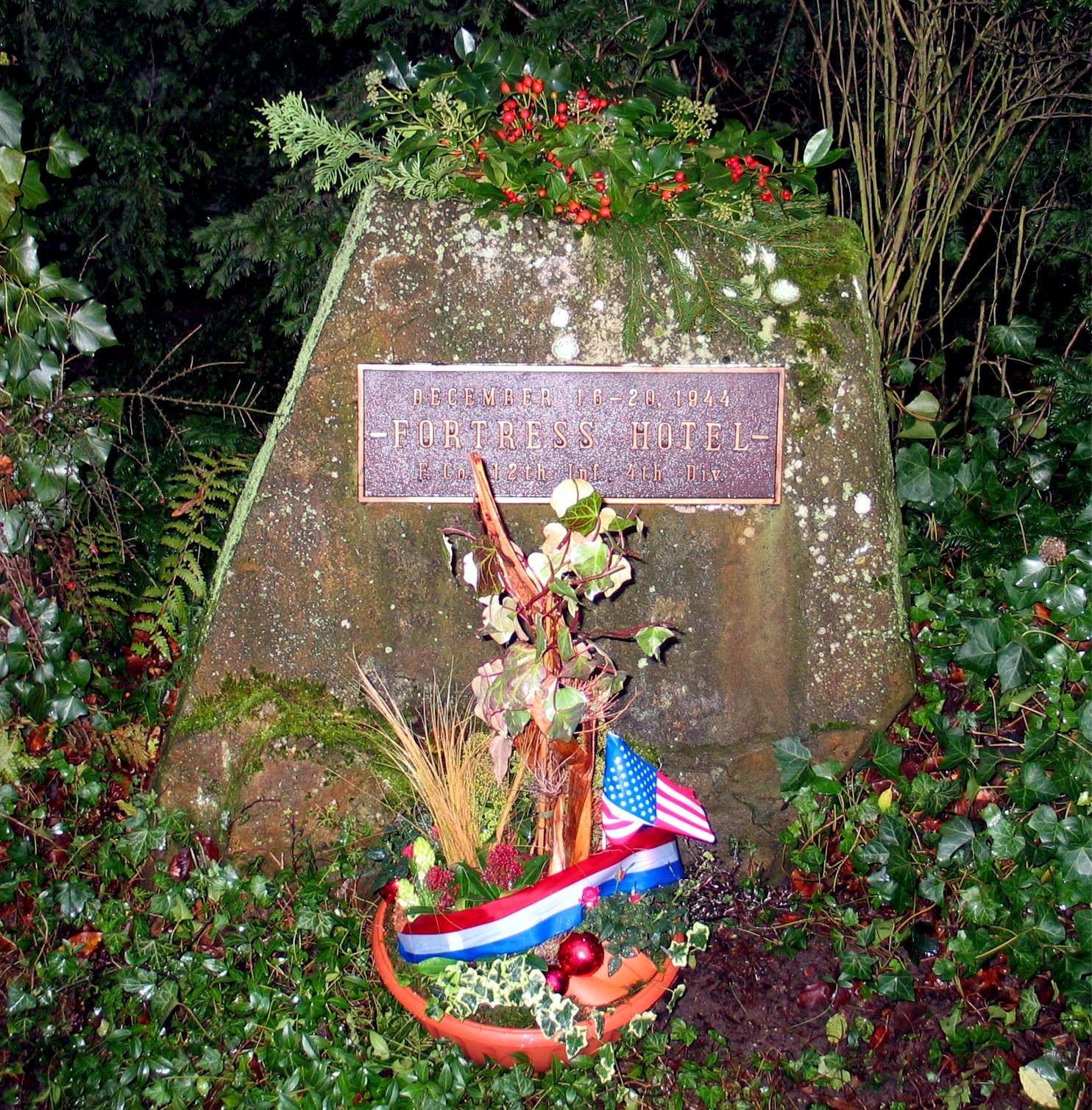 Prior to being wounded the third time, Clyde and his unit were stationed in a town called Berdorf. Their Headquarters was located in the “Hotel Parc” later changed to the “Fortress Hotel”. The men, when possible, would sleep inside the hotel as the temperature was extremely cold. After the war the town people of Berdorf had a plaque made to honor the men of Company F. The sign has been taken down as the Hotel Parc is being rebuilt. My wife and I have visited this town twice and had not been able to see the sign. I asked my brother-in-laws sister to help me get a picture of the sign. She contacted the town government and explained the situation. They not only took a picture of the sign, they put a basket in front with an American Flag. Here is that sign: