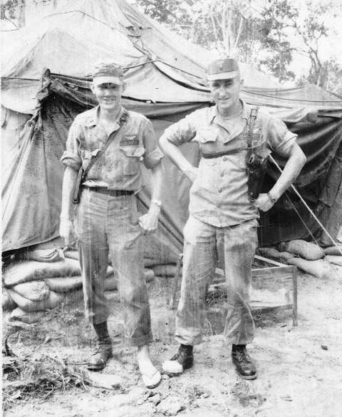 The second picture is of me on left and WO John Hilburn at Camp Radcliff a couple of days after the 3 November 1965 Ambush. (You can read about the Ambush in Hal Moore’s book, ( We were Soldiers Once and Young). I was wounded while dropping off ammo in the Hot LZ a little past midnight, John stubbed his toe while running to the bunker at night during a mortar attack.