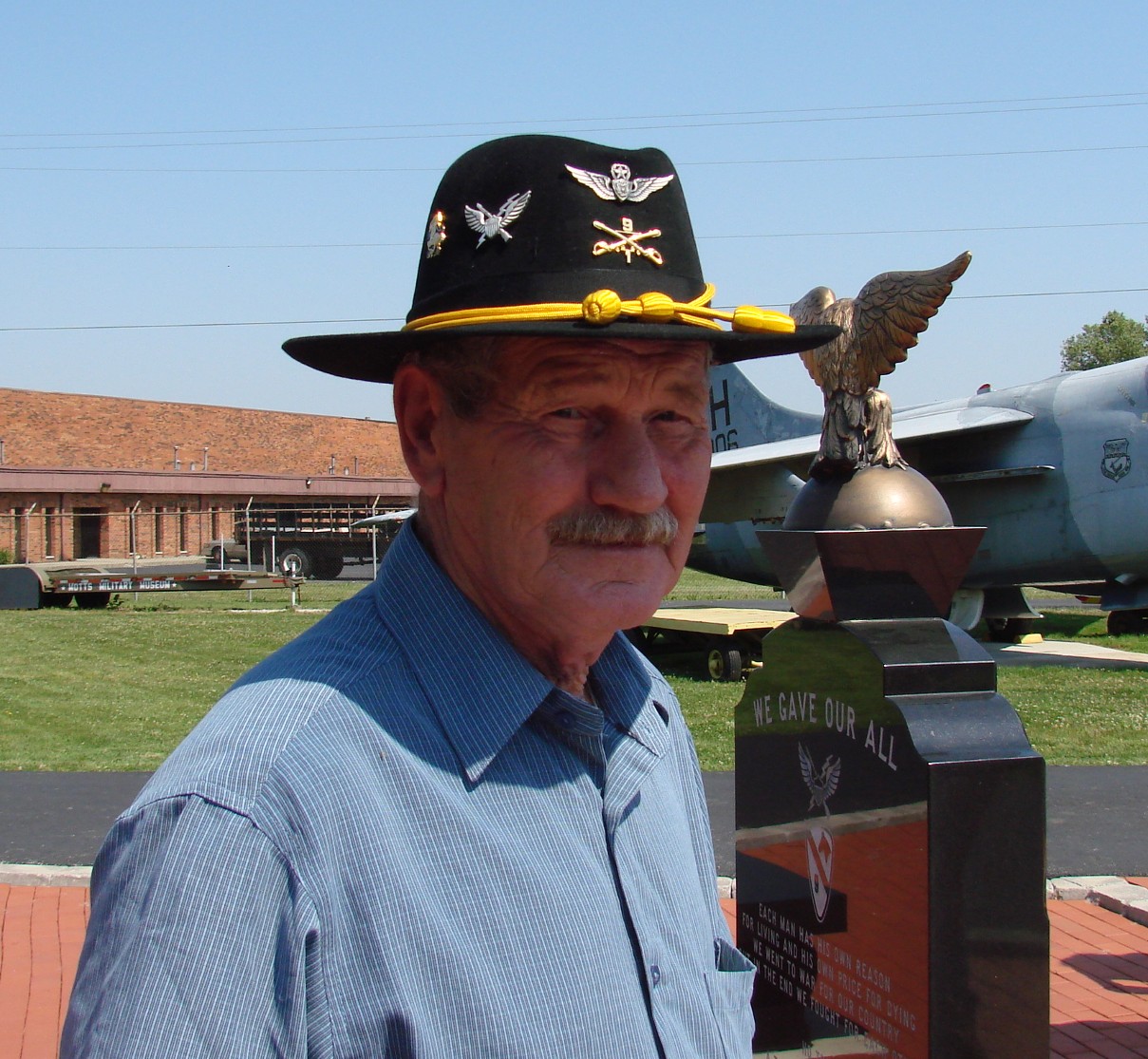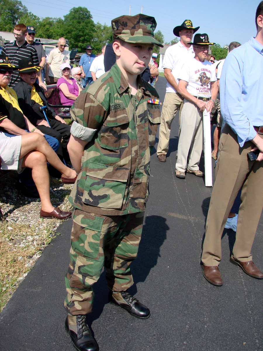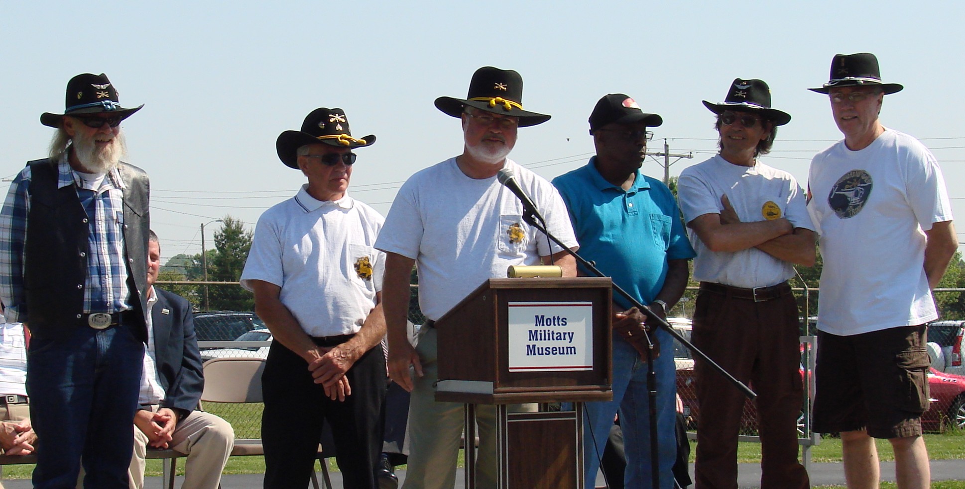 The ceremony started with the usual dignitaries to include the State Congressman (MR Stivers) who was instrumental in aiding Nate at getting 990 and to bring her home. On the stage was a survivor of Pearl Harbor, Nate Shafer, Bruce Campbell, Russell Hauser, Herb Skinner, Barry Sipple and Greg Jayne. Bruce Campbell was the pilot of Zit 990. Russell Hauser was the Crew Chief and Nate Shafer was the door gunner. It is not very often that one can find the crew who served on one helicopter (40 years esrlier) but to get them all in one place at one time was very special. This was a very special day. As I looked around, I saw many Stetsons and most of them wear bearing the 1/9th Crossed Sabers. I also notice that from the very young to the more chronologically challenge were present.