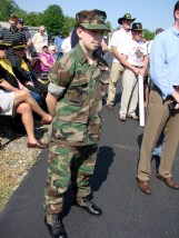 Now it was Nate’s turn to talk. Nate was short and to the point letting everyone know who helped in Zit 990 and making it possible to bring her home. Nate gave special recognition to his beautiful wife TIZ who backed his every move. Then he asked Bruce Campbell to say a few words. Bruce addressed the crowd eloquently. He told the crowd what a Pink Team was and how Zit 990 fit into it. He explained some of the missions that 990 participated in. Bruce did an excellent job at explaining to those who had no concept of what actually took place in Vietnam. Then Greg Jayne, Russ Hauser, Barry Sipple and Al De Mailo took turns at adding comments. After the speeches, the men of the local DAV firing squad rendered the 21 gun salute and then Taps was played.
